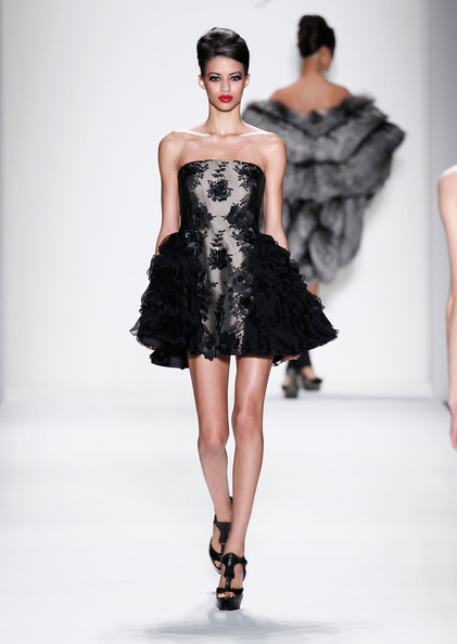 Farah Angsana wowed the audience this morning at the Lincoln center with a combination of glitzy bead-embellished chiffon hand draped gowns, wool coats, and strappy heels. Gowns in royal blue, teal, scarlett, brown and black all had one thing in common aside from fluidity; beaded embroidery. Our favorite was the finale, a white silk crystal encrusted gown with feather and organza ruffles, along with a silver fox stole that had the entire audience in a standing ovation and someone saying to me, "could you imagine entering a dinner party in THAT? Everyone would be envious."